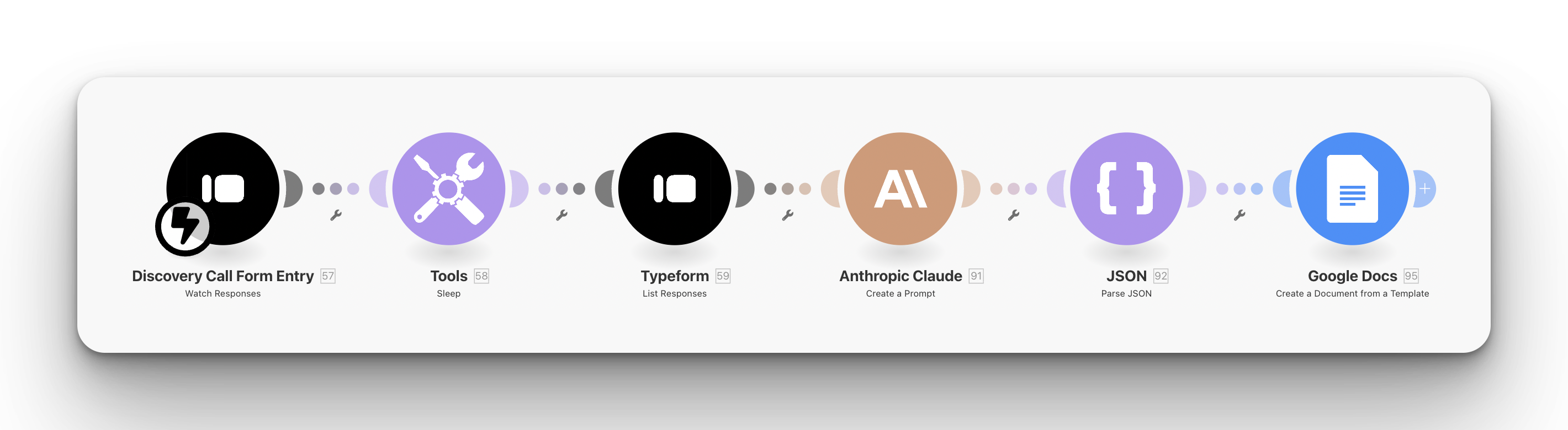 The complete Make.com workflow: Typeform → Claude AI → Google Docs (click to enlarge)